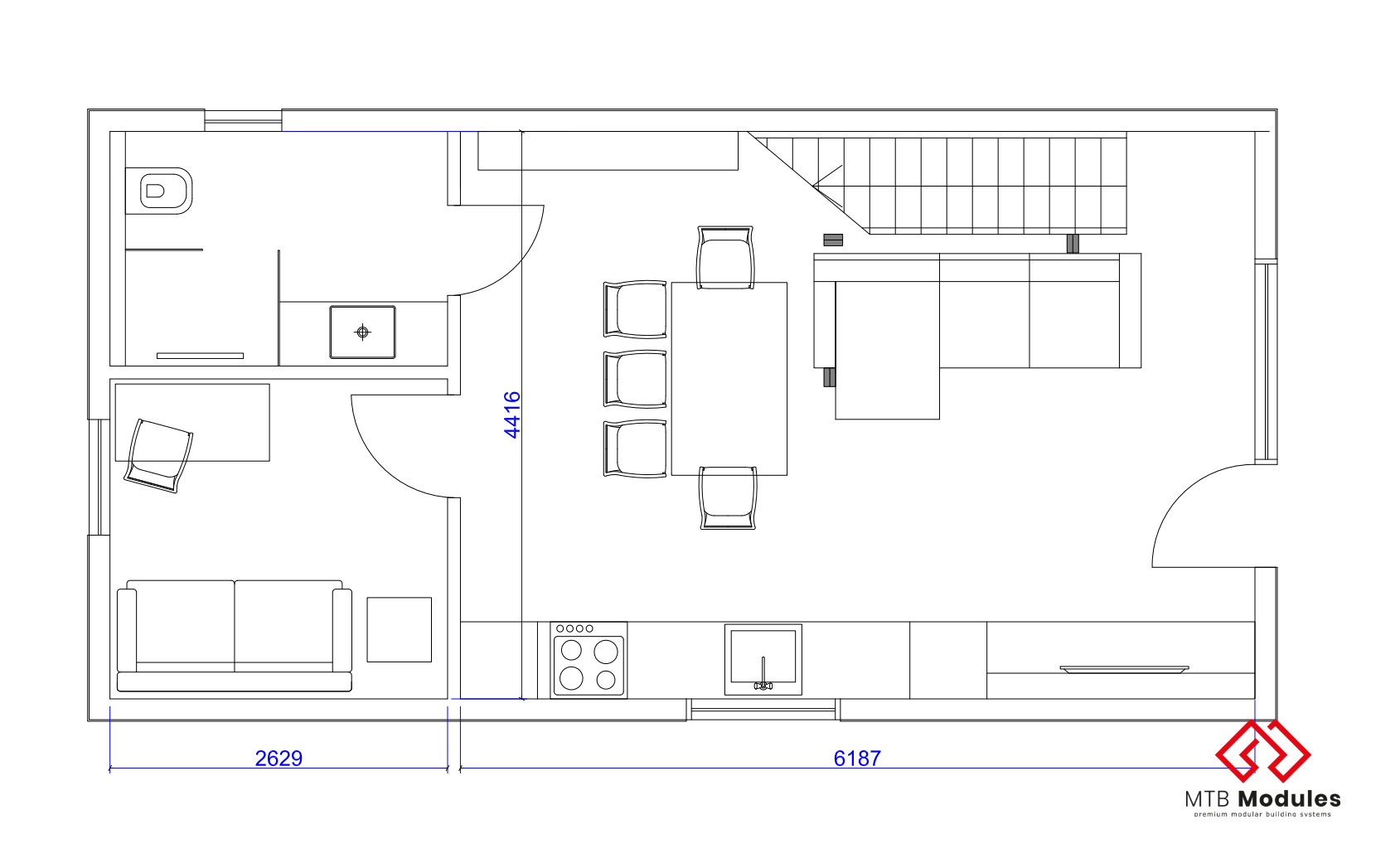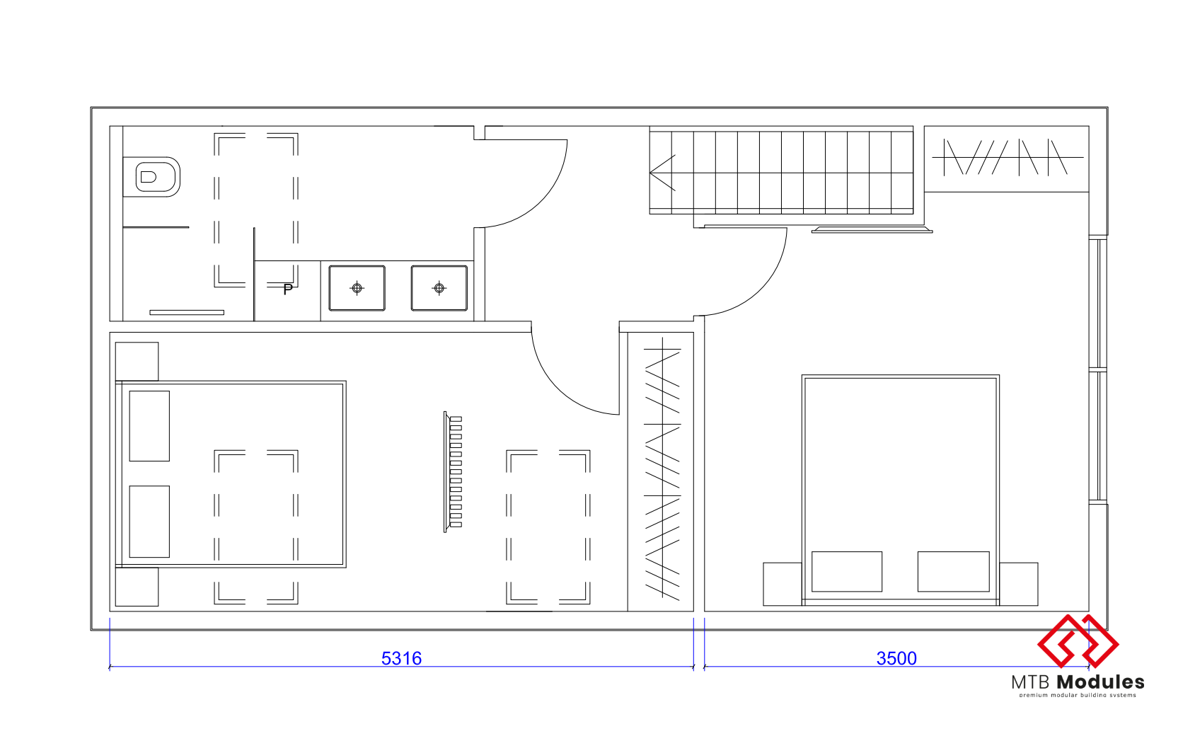 La caseta MTB SIX dispone de 88m2, con una altura hasta cumbrera de 5.50m, una anchura de 4.92m y un largo de 10m. Ha sido ideada para disponer en la planta baja de un vestíbulo, baño y un amplio salón con cocina. En la planta superior cuenta con dos habitaciones con capacidad para albergar cada una de ellas una cama de matrimonio y un baño de mayor tamaño.